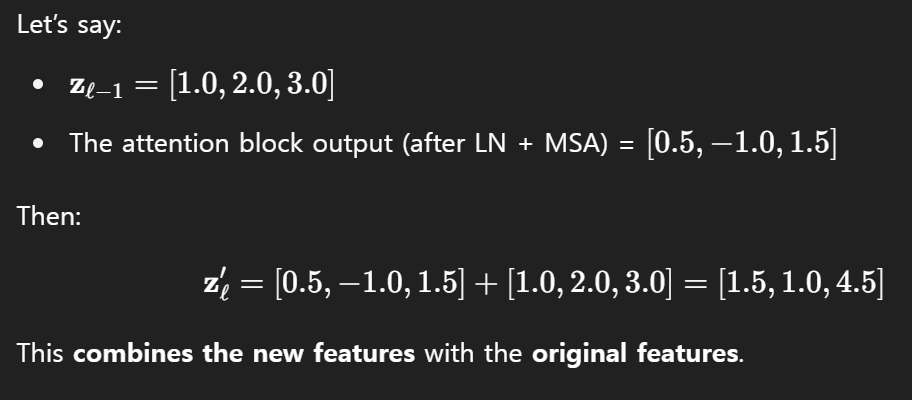 이런 식으로 구성된 것 (MSA 멀티헤드 셀프 어텐션 (LN 레이어 정규화) ) + 첫번째 식에서 구한 것