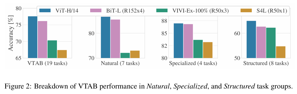 | Task 그룹 | 설명 | ViT-H/14 | BiT-L (R152x4) | VIVI-Ex-100% (R50x3) | S4L |