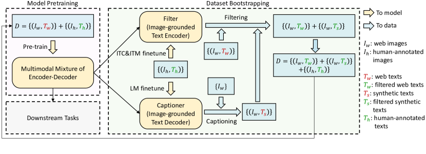 - CapFilt로 부트스트래핑된 새로운 데이터셋으로 사전학습