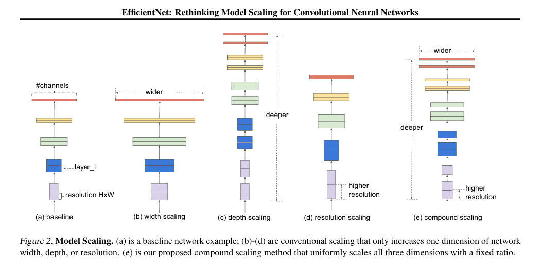 | 해결책 | 너비·깊이·해상도를 비율 기반으로 함께 확장하는 compound scaling 제안 |