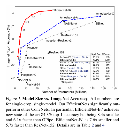 - EfficientNet-B3는 ResNeXt-101보다 정확도가 높고, FLOPS는 18배 작음